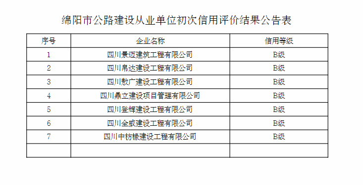 綿陽(yáng)市公路建設(shè)從業(yè)單位初次信用評(píng)價(jià)結(jié)果公告表.pdf